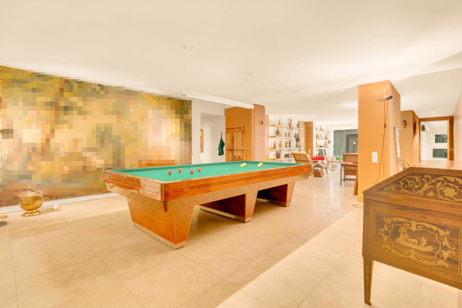 Il piano interrato, denominato “piano giardino” per la sua posizione affacciata sull’esterno e caratterizzata da ampie vetrate, si apre sul livello più basso del giardino: a est verso il bosco, a sud verso il roseto e la piscina, e a ovest su un cortile con porticato. Questo livello ospita una completa zona per gli ospiti con camera, bagno, sauna e vasca idromassaggio doppia. È presente inoltre uno studio – facilmente convertibile in una quinta camera da letto – con cabina armadio e bagno en suite. Completano il piano un ampio salone con grande camino e vetrate affacciate sul verde, uno spazio dedicato al biliardo con saletta per il gioco a carte, oltre a una cucina con dispensa e una cantinetta per i vini.